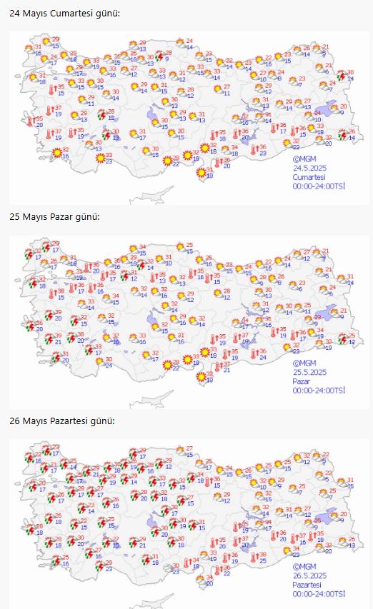25 Mayıs Pazar günü batı bölgelerde güneşli hava etkili olurken, doğudaki yağışların etkisini azaltması bekleniyor. Sıcaklıklar 12 ila 37 derece arasında değişecek.