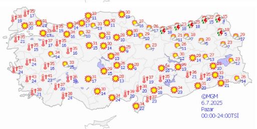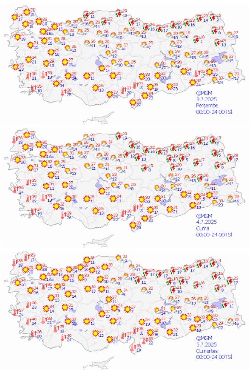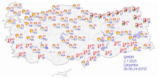 Özellikle Ege ve Akdeniz bölgelerinde termometreler 40 ila 43 dereceyi gösterecek. Bugün ise batı ve güney kıyılarında sıcaklıkların mevsim normallerinin 2-4 derece üzerinde, kuzey ve iç kesimlerde ise 1-3 derece altında seyredeceği bildirildi.