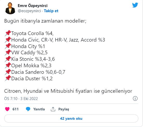 Otomotiv sektörünü yakından takip eden gazetecilerden Emre Özpeynirci ise sosyal medya hesabından zamlanan modelleri paylaştı.