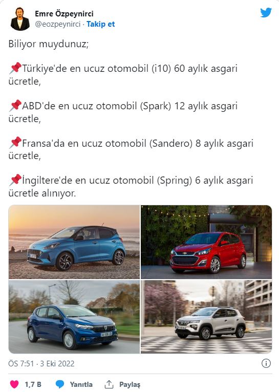 “Biliyor muydunuz; Türkiye'de en ucuz otomobil (i10) 60 aylık asgari ücretle, ABD'de en ucuz otomobil (Spark) 12 aylık asgari ücretle, Fransa'da en ucuz otomobil (Sandero) 8 aylık asgari ücretle, İngiltere'de en ucuz otomobil (Spring) 6 aylık asgari ücretle alınıyor.”