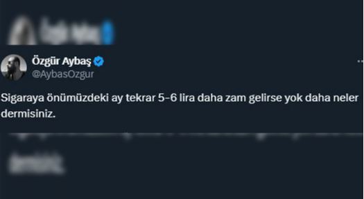 Aybaş, X hesabı üzerinden yaptığı açıklamasında, “Eğer sigaraya önümüzdeki ay 5-6 lira daha zam yapılırsa, yok daha neler der misiniz?” ifadelerine yer verdi.
