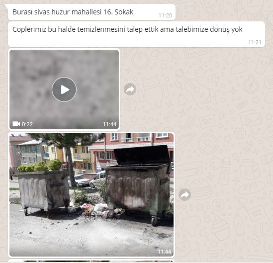 Büyük Sivas Medya Grubu WhatsApp Haber Hattına (0555 898 15 58) Sivas'ın her bölgesinden adeta şikayet yağıyor. Çöplerle ilgili yaşanan sıkıntıları vatandaşlar aşağıdaki mesajlarla dile getirmeye çalışırken bizlerden de bu konuyu gündeme taşıyarak yetkililere duyurmamız isteniyor.
