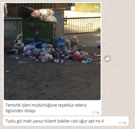 "Temizlik işleri müdürlüğüne teşekkür ederiz ilgisinden dolayı. Tuzlu göl mah yavuz bülent bakiler cad uğur apt no 4"