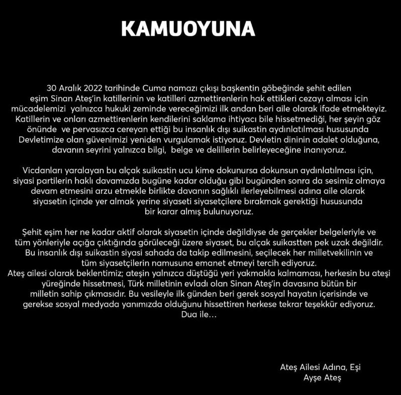 Paylaşımda, "İnsanlık dışı suikastin aydınlatılması hususunda devletimize olan güvenimizi yeniden vurgulamak istiyoruz" denildi. Ayşe Ateş'in açıklaması şöyle: