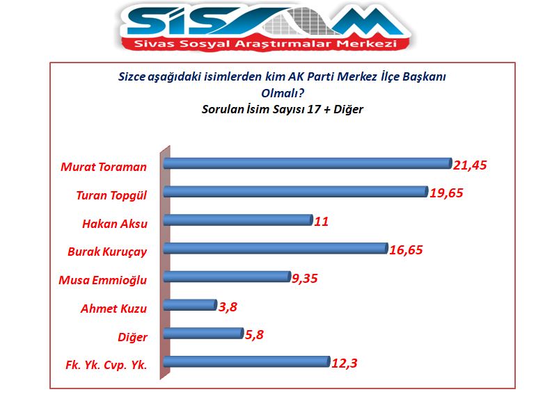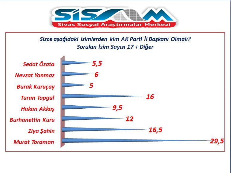 Bu soruda en yüksek oranı alan ise yüzde 29,5 yüzde ile AK Parti İl Genel Meclis Üyesi, AK Parti Sivas Gençlik Kolları E. Başkanı Murat Toraman aldı. Daha sonra sırasıyla yüzde 16,5 ile Ziya Şahin, yüzde 16 ile Turan Topgül, yüzde 12 ile Burhanettin Kuru, yüzde 9,5 ile Hakan Akkaş, yüzde 6 ile Nevzat Yanmaz, yüzde 5,5 ile Sedat Özata ve yüzde 5 ile Burak Kuruçay sıralamada yer aldı.