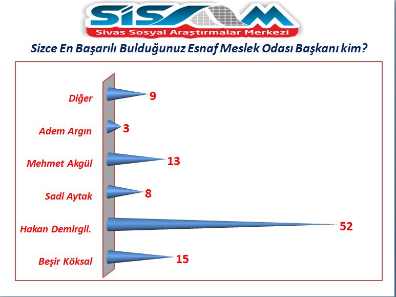 Bir diğer “sizce en başarılı bulduğunuz esnaf meslek odası başkanı kim?” sorusuna karşılık en yüksek puanlamayı yüzde 52 ile Tesviyeciler ve Madeni Sanatkarlar Esnaf Odası Başkanı Hakan Demirgil aldı. Daha sonra sırasıyla yüzde 15 ile Sivas Esnaf ve Sanatkarlar Odası Başkanı Beşir Köksal, yüzde 13 Sivas Yiyecek Maddeleri Yapanlar ve Satanlar Esnaf Odası Başkanı Mehmet Akgül, yüzde 9 diğer, yüzde 8 Sivas Elektrikçiler Esnaf ve Sanatkarlar Odası Başkanı Sadi Aytak ve yüzde 3 ile Sivas Pazarcılar Odası Başkanı Adem Argın yer aldı.