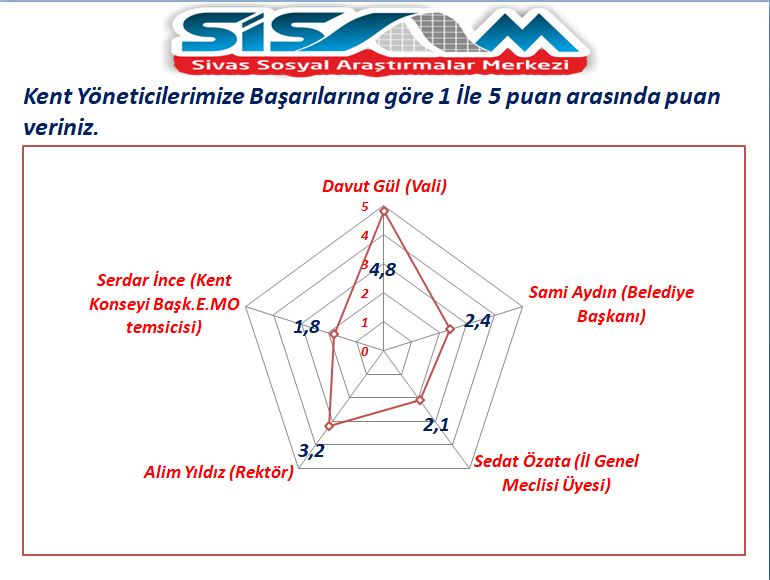 Bir diğer “Kent yöneticilerimizi başarılarına göre 1 ile 5 puan arasında puan veriniz” sorusuna karşılık en yüksek puanlamayı 4,8 oran ile Sivas Valisi Davut aldı. Daha sonra sırasıyla 3,2 oran ile Cumhuriyet Üniversitesi Rektörü Prof. Dr. Alim Yıldız, 2,4 oran ile Sivas Belediye Başkanı Sami Aydın, 2,1 oran ile İl Genel Meclis Üyesi Sedat Özata ve 1,8 oran ile Kent Konseyi Başkanı Serdar İnce yer aldı.