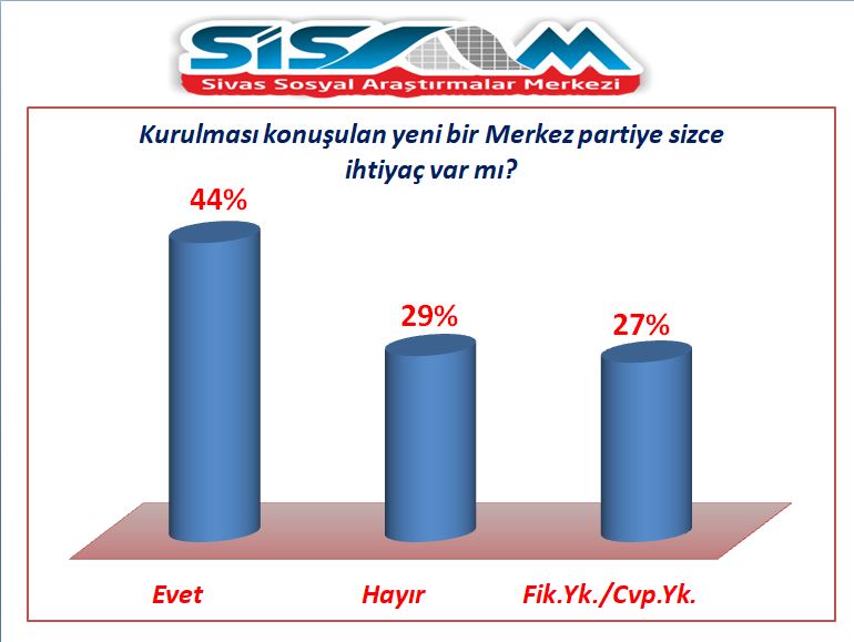 Bir diğer “Kurulması konuşulan yeni bir merkez partiye sizce ihtiyaç var mı?” sorusu yüzde 44 evet, yüzde 29 hayır ve yüzde 27 fikrim yok olarak kayıtlarda yerini aldı.