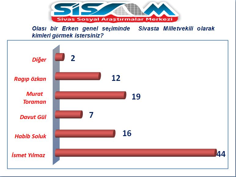 Bir diğer “Olası bir erken genel seçiminde Sivas’ta milletvekili olarak kimleri görmek istersiniz? Soruna karşılık en yüksek oranı yüzde 44 ile Milli Eğitim Bakanı İsmet Yılmaz oldu. Daha sonra sırasıyla yüzde 19 ile AK Parti İl Genel Meclis Üyesi, AK Parti Sivas Gençlik Kolları E. Başkanı Murat Toraman, yüzde 16 AK Parti Sivas Milletvekili M. Habib Soluk, yüzde 12 Ragıp Özkan, yüzde 7 Davut Gül ve yüzde 2 diğer yer aldı.