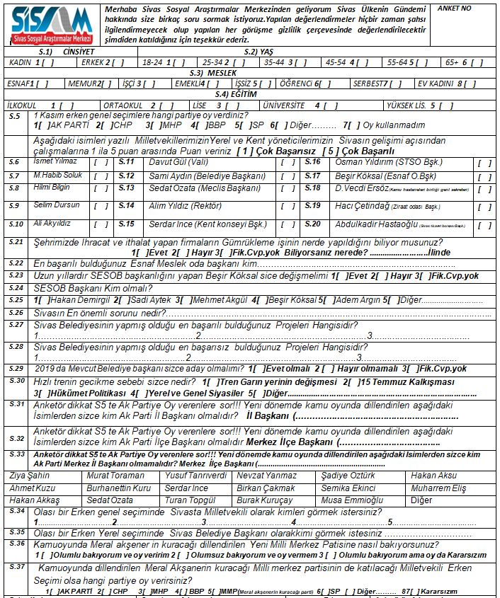 SİSAM, Sivas il merkezindeki 65 mahalleyi temsil eden 10 ayrı bölgede, belirli kotalarla 18+ yaş grubundaki 1.647 adet seçmen ile yüz yüzü görüşme metodu ile raporunu tamamladığını açıkladı.