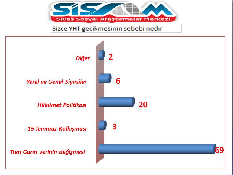 Bir diğer “Sizce YHT gecikmesinin sebebi nedir?” sorusuna karşılık vatandaşların yüzde 69’u Tren garının yerinin değişmesi olarak gösterdi. Daha sonra yüzde 20’si hükümet politikası derken, yüzde 6yerel ve genel siyasiler, yüzde 3 15 Temmuz kalkışması ve yüzde 2 diğer olarak kayıtlara geçti.