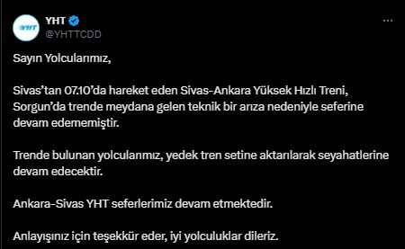 Açıklamada “Sivas’tan 07.10’da hareket eden Sivas-Ankara Yüksek Hızlı Treni, Sorgun’da trende meydana gelen teknik bir arıza nedeniyle seferine devam edememiştir. Trende bulunan yolcularımız, yedek tren setine aktarılarak seyahatlerine devam edecektir. Ankara-Sivas YHT seferlerimiz devam etmektedir.” denildi.