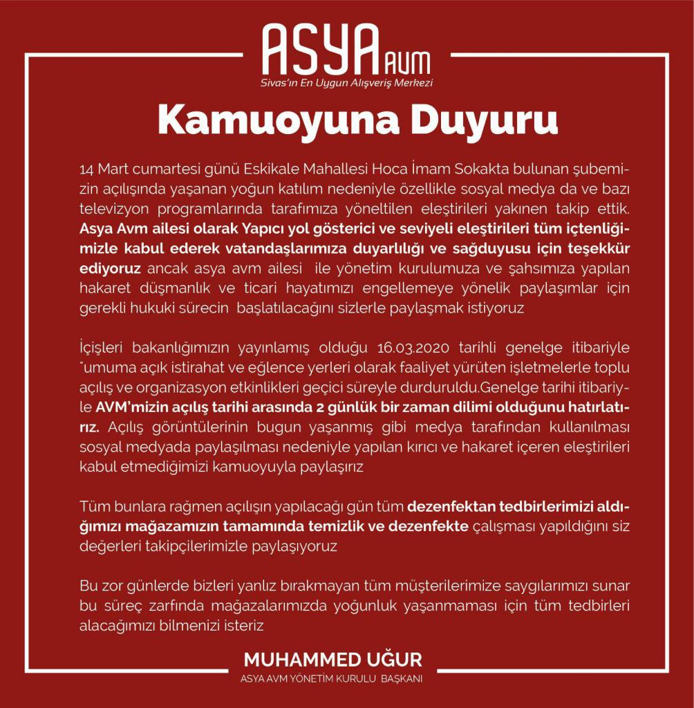 Asya avm ailesi olarak Yapıcı yol gösterici ve seviyeli eleştirileri tüm içtenliğimizle kabul ederek vatandaşlarımıza duyarlılığı ve sağduyusu için teşekkür ediyoruz ancak asya avm ailesi ile yönetim kurulumuza ve şahsımıza yapılan hakaret düşmanlık ve ticari hayatımızı engellemeye yönelik paylaşımlar için gerekli hukuki sürecin başlatılacağını sizlerle paylaşmak istiyoruz.