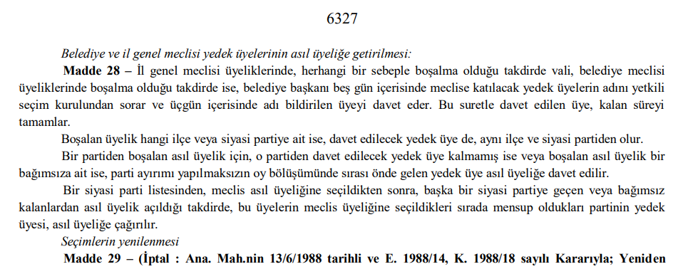 "Madde 28 – İl genel meclisi üyeliklerinde, herhangi bir sebeple boşalma olduğu takdirde vali, belediye meclisi üyeliklerinde boşalma olduğu takdirde ise, belediye başkanı beş gün içerisinde meclise katılacak yedek üyelerin adını yetkili seçim kurulundan sorar ve üçgün içerisinde adı bildirilen üyeyi davet eder. Bu suretle davet edilen üye, kalan süreyi tamamlar.