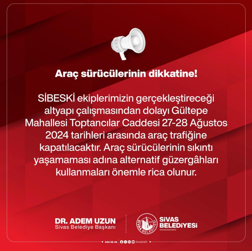 Sivas Belediyesi 27-28 Ağustos tarihlerinde bazı yolların kapalı olacağını açıkladı.