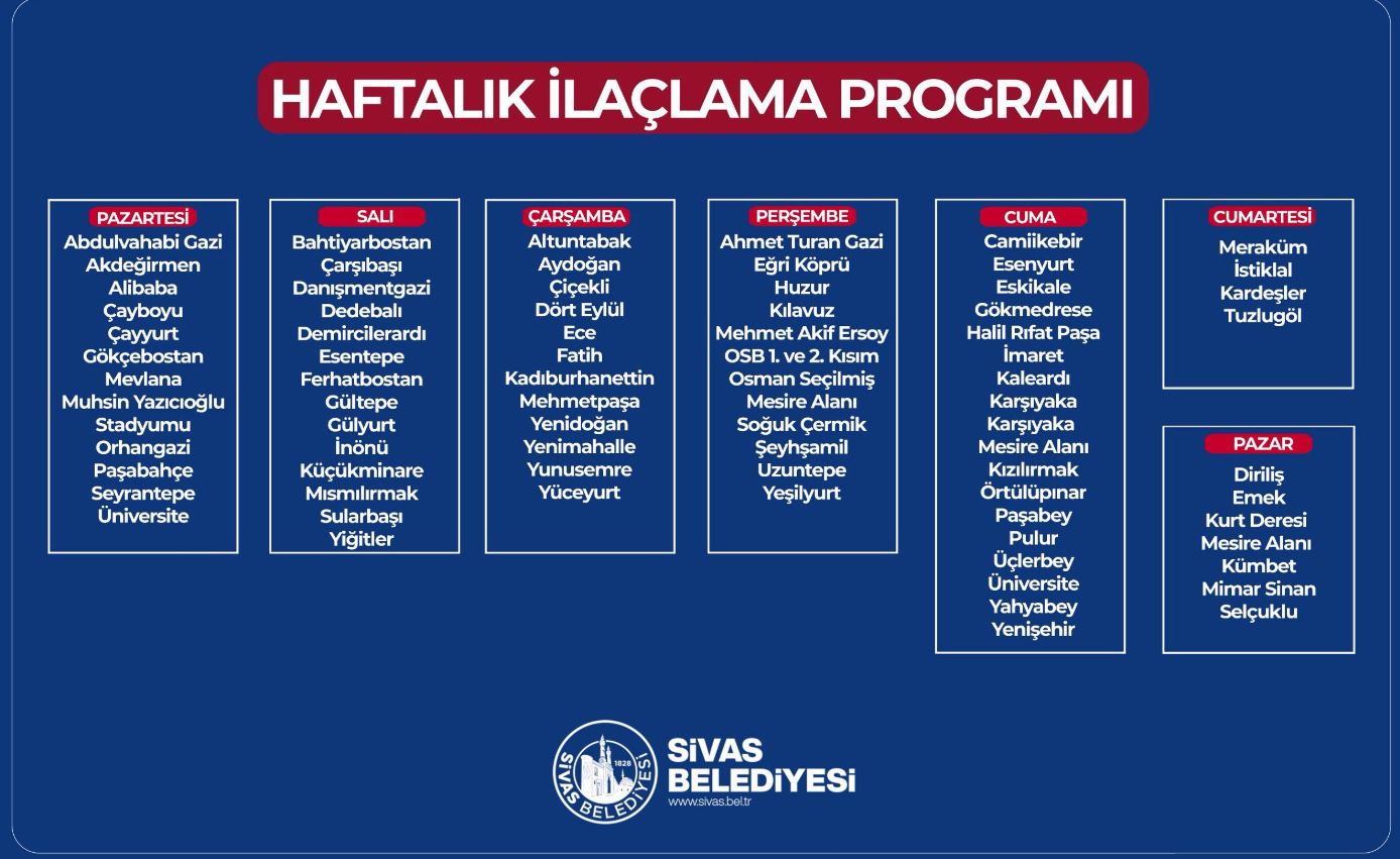 Yaz boyu sürecek haftalık ilaçlama programı şöyle:
