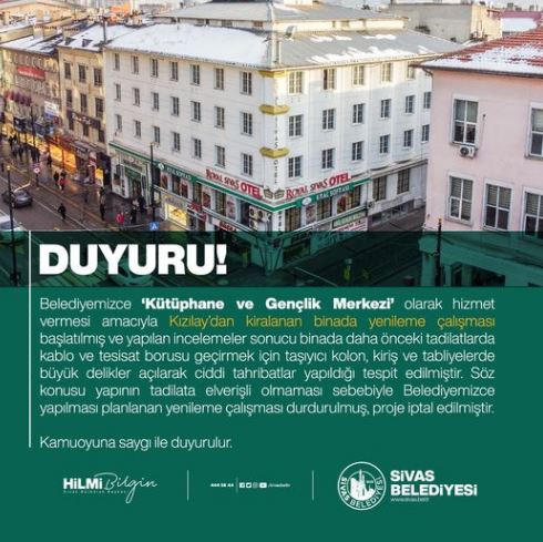 Sivas Belediyesi dün ve bugün yayınladığımız haberlerin ardından bir açıklama yaparak binaya yapılacak olan projeden vazgeçtiğini duyurdu.