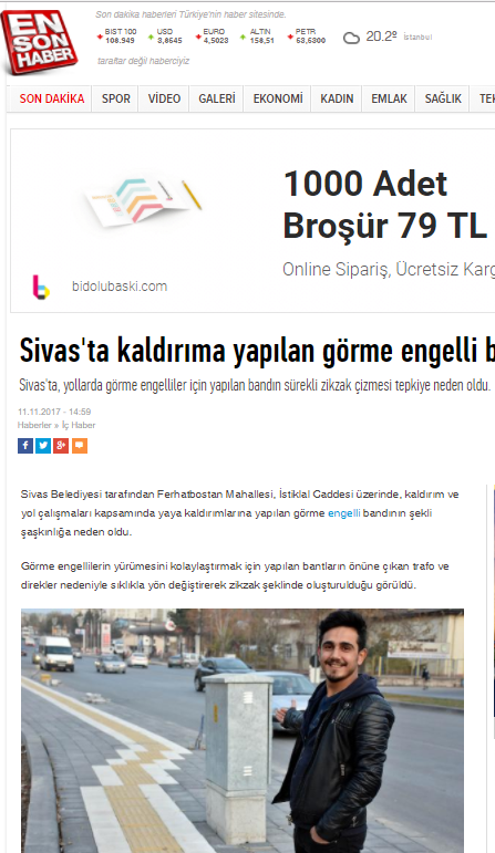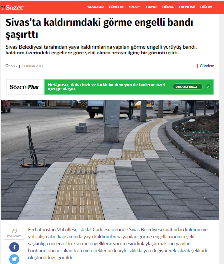 Görme engellilerin kolaylıkla kaldırımda yürüyebilmesi için yapılan engelli bandında adeta engellilere zorluk çıkaracak zik zak kaldırım çalışması Sivas başta olmak üzere ulusal gazetelerde de yerini aldı.