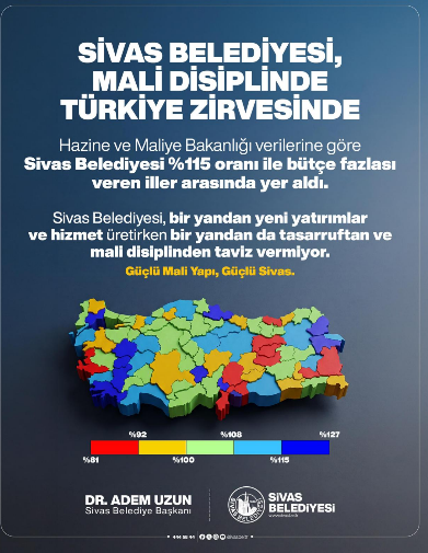 Sivas Belediyesi mali disiplinde Türkiye zirvesinde.. Hazine ve Maliye Bakanlığı tarafından yayımlanan ve yerel yönetimlerin mali yeterlilik oranlarını ortaya koyan “bütçesi fazla veren belediyeler” haritasında Sivas, yüzde 115,22 bütçe yeterlilik oranıyla dikkat çekti.
