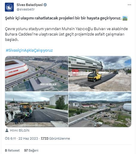 Sivas Belediyesi tarafından yapılan açıklamada : "Şehir içi ulaşımı rahatlatacak projeleri bir bir hayata geçiriyoruz. 🛣