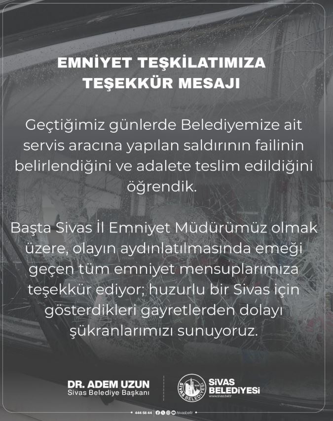 Sivas Belediyesi, servis aracı saldırısı, emniyet teşekkür, Sivas İl Emniyet Müdürlüğü, güvenlik, belediye açıklaması