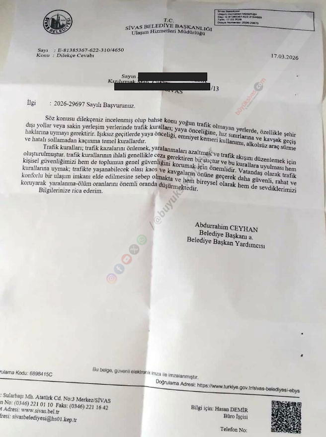 Sivas’ta trafik sorunu nedeniyle belediyeye başvuruda bulunan bir vatandaşa verilen resmi cevap, kamuoyunda şaşkınlık ve tepkiye neden oldu.