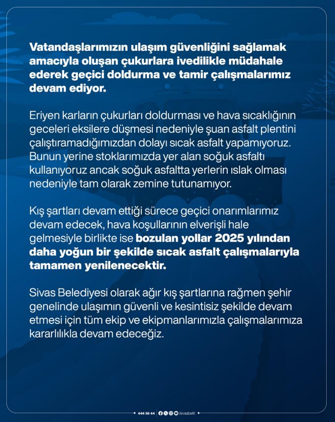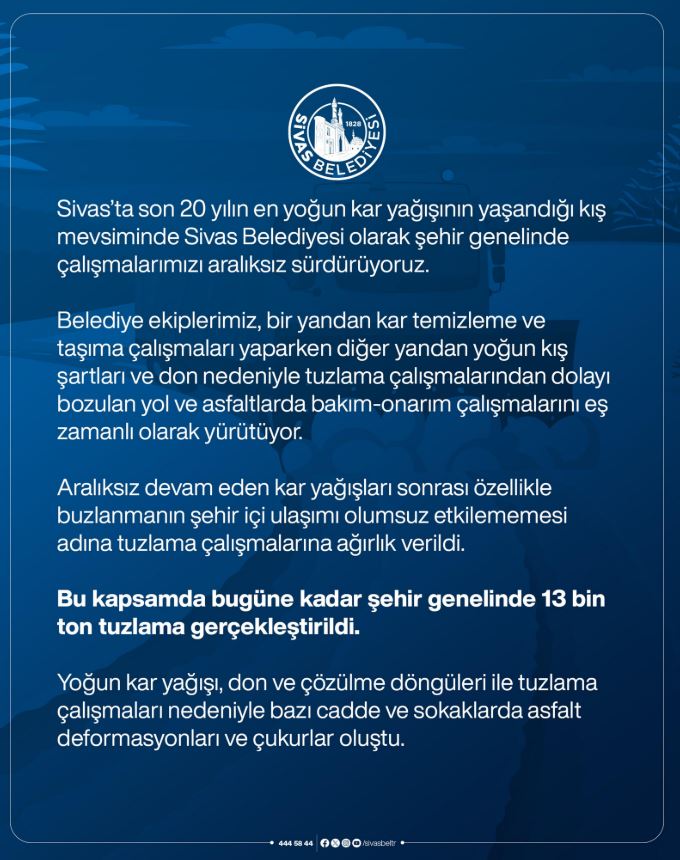 Sivas Belediyesinden Açıklama.. Sivas’ta son 20 yılın en yoğun kar yağışının yaşandığı kış mevsiminde belediye ekipleri şehir genelinde çalışmalarını aralıksız sürdürüyor. Yoğun kar yağışı, don ve çözülme döngüleri nedeniyle bazı cadde ve sokaklarda asfalt deformasyonları ve çukurlar oluştuğu bildirildi.