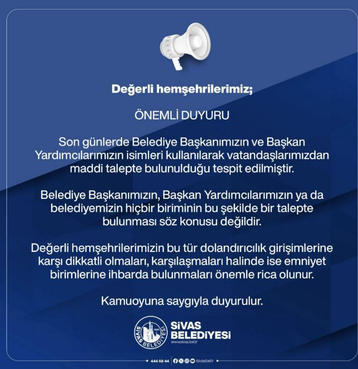 Sivas Belediyesi, son günlerde Belediye Başkanı ve Başkan Yardımcılarının isimleri kullanılarak vatandaşlardan maddi yardım talebinde bulunulduğuna dair dolandırıcılık girişimlerine karşı önemli bir uyarı yayımladı.