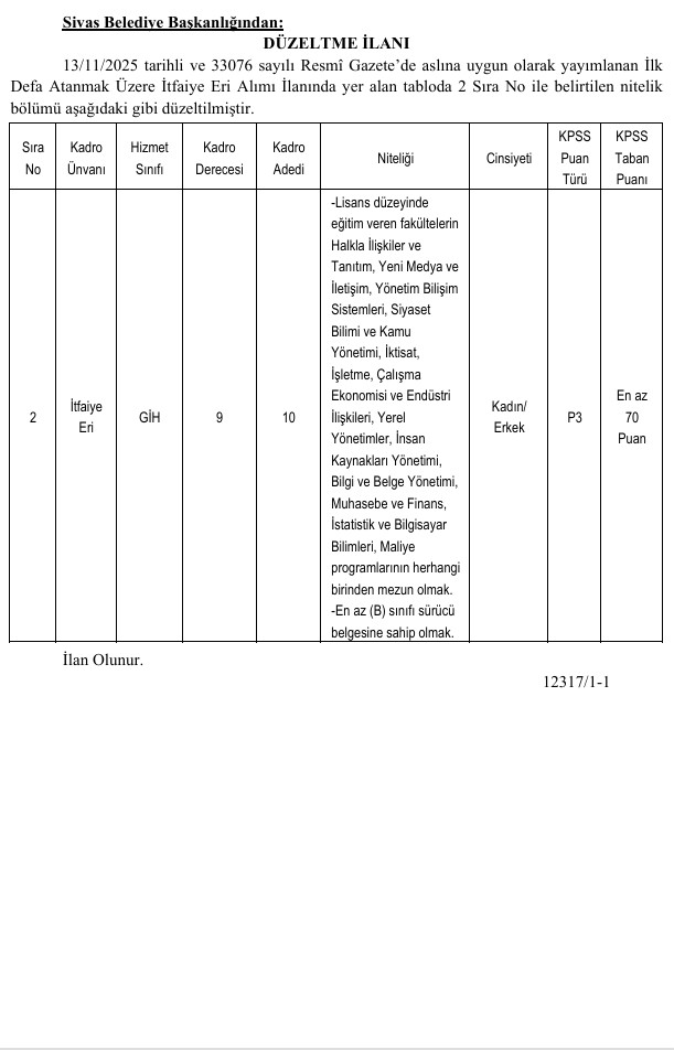 Sivas Belediyesi, 13 Kasım 2025 tarihli ve 33076 sayılı Resmî Gazete’de yayımlanan “İlk Defa Atanmak Üzere İtfaiye Eri Alımı” ilanında yer alan tabloda 2. sıra numarasındaki kadronun nitelik bölümünde düzenleme yapıldığını duyurdu.