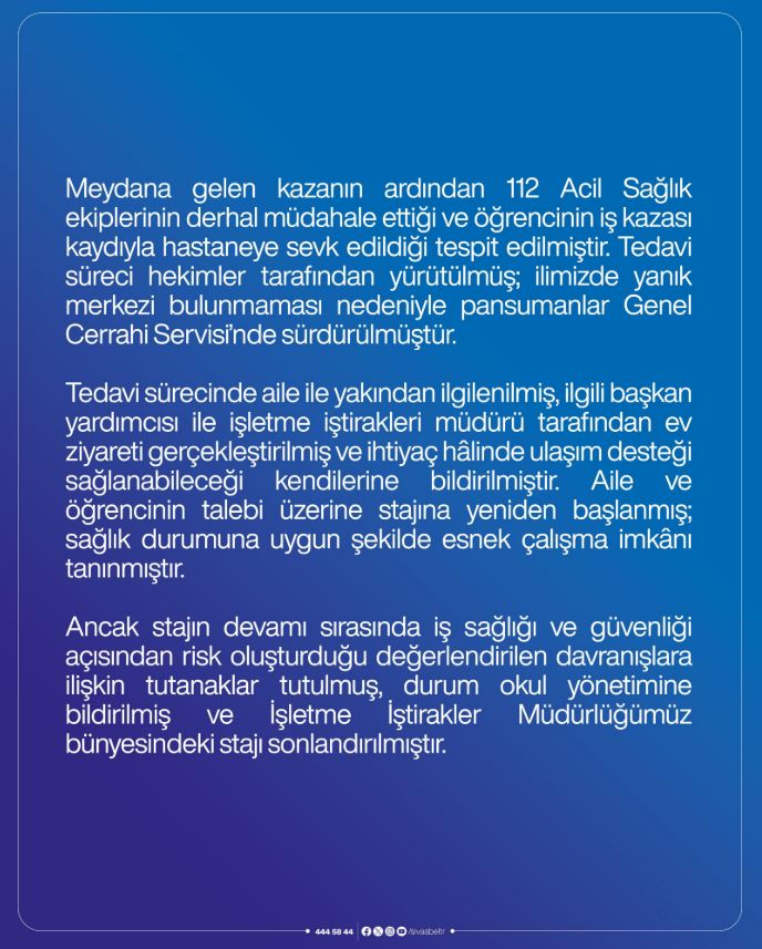 Kazanın ardından 112 Acil Sağlık ekiplerinin müdahale ettiği ve öğrencinin iş kazası kaydıyla hastaneye sevk edildiği belirtilen açıklamada, tedavi sürecinin hekimler tarafından yürütüldüğü, aileyle yakından ilgilenildiği ve ihtiyaç halinde ulaşım desteği sağlanabileceğinin bildirildiği ifade edildi.