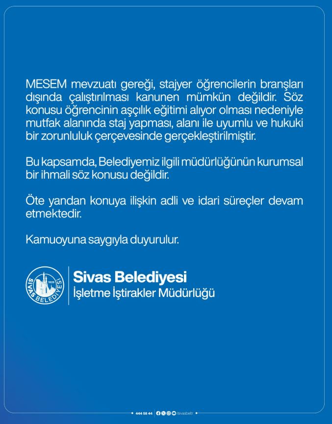 Sivas Belediyesi’nden MESEM Öğrencisi Olayına İlişkin Açıklama.. Sivas’ta Mesleki Eğitim Merkezi (MESEM) kapsamında bir işletmede staj yapan 17 yaşındaki öğrencinin iş kazası geçirdiğine ilişkin iddiaların ardından Sivas Belediyesi İşletme İştirakler Müdürlüğü tarafından kamuoyuna açıklama yapıldı.