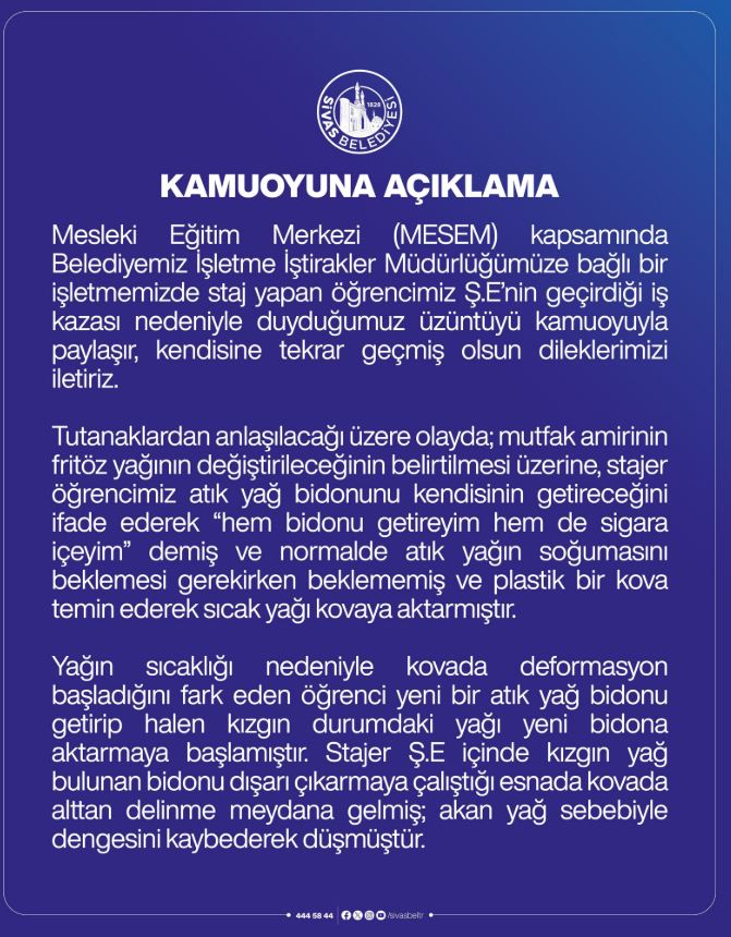 Belediye tarafından yapılan açıklamada, söz konusu öğrencinin staj yaptığı işletmede yaşanan iş kazası nedeniyle üzüntü duyulduğu belirtilerek, olayın tutanaklara göre fritöz yağının değiştirilmesi sırasında meydana geldiği ifade edildi. Açıklamada, mutfak amirinin fritöz yağının değiştirileceğini belirtmesinin ardından stajyer öğrencinin atık yağ bidonunu getireceğini söylediği, normalde soğuması beklenmesi gereken yağın beklenmeden plastik kovaya aktarılması sonucu kovada deformasyon oluştuğu kaydedildi. Öğrencinin yağı başka bir bidona aktarmaya çalıştığı sırada kovada delik oluştuğu ve akan yağ nedeniyle dengesini kaybederek düştüğü aktarıldı.