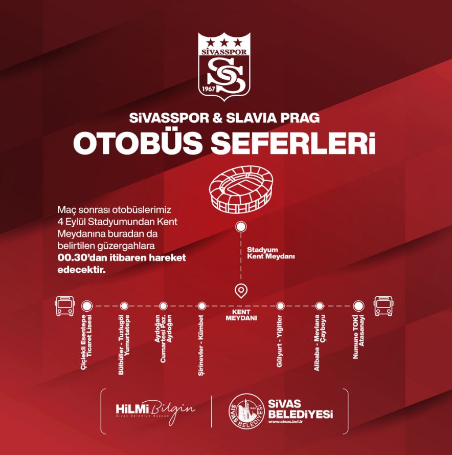 Sivas Belediyesinin sosyal medya hesabından yapılan açıklamada: "Sivasspor'umuzun Slavia Prag ile oynayacağı karşılaşmanın geç saatlerde bitecek olmasından dolayı taraftarlarımızın ulaşımda sıkıntı yaşamaması adına Stadyum'dan Kent Meydanı'na, buradan da mahallelerimize ek otobüs seferleri düzenlenecektir." ifadelerine yer verildi.
