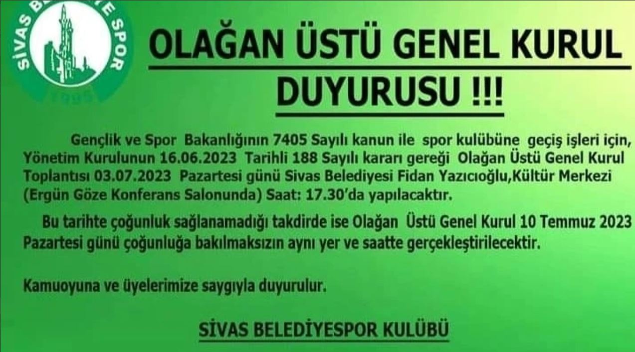 Sivas Belediyespor Olağanüstü Genel Kurul Toplantısı Yarın
