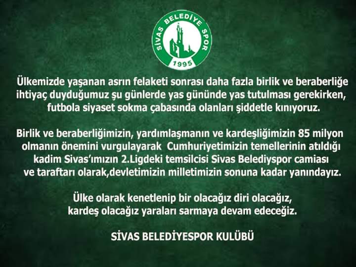 Birlik ve beraberliğimizin, yardımlaşmanın ve kardeşliğimizin 85 milyon olmanın önemini vurgulayarak Cumhuriyetimizin temellerinin atıldığı kadim şehrimiz Sivas’ımızın 2.Ligdeki temsilcisi Sivas Belediyespor camiası ve taraftarı olarak, devletimizin ve milletimizin sonuna kadar yanındayız.