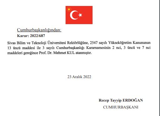 Resmi Gazete’de yayımlanan atama kararlarına göre, Bursa Üniversitesi Rektörlüğü’ne Prof.Dr. Naci Çağlar, Erzurum Teknik Üniversitesi Rektörlüğü’ne Prof.Dr. Bülent Çakmak, Kahramanmaraş Sütçü İmam Üniversitesi Rektörlüğü’ne Prof.Dr. İsmail Bakan, Necmettin Erbakan Üniversitesi Rektörlüğü’ne Prof.Dr. Cem Zorlu, Sivas Bilim ve Teknoloji Üniversitesi Rektörlüğü’ne Prof.Dr. Mehmet Kul ve Tekirdağ Namık Kemal Üniversitesi Rektörlüğü’ne Mümin Şahin atandı. Atama karalarının Yüksek Öğretim Kanunu’nun 13’üncü maddesi ile 3 sayılı Cumhurbaşkanlığı Kararnamesi’nin 2. 3. ve 7. Maddeleri gereğince yapıldığı belirtildi.