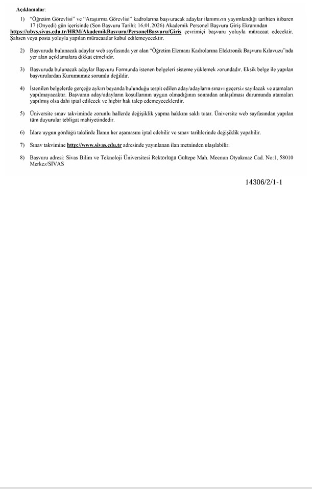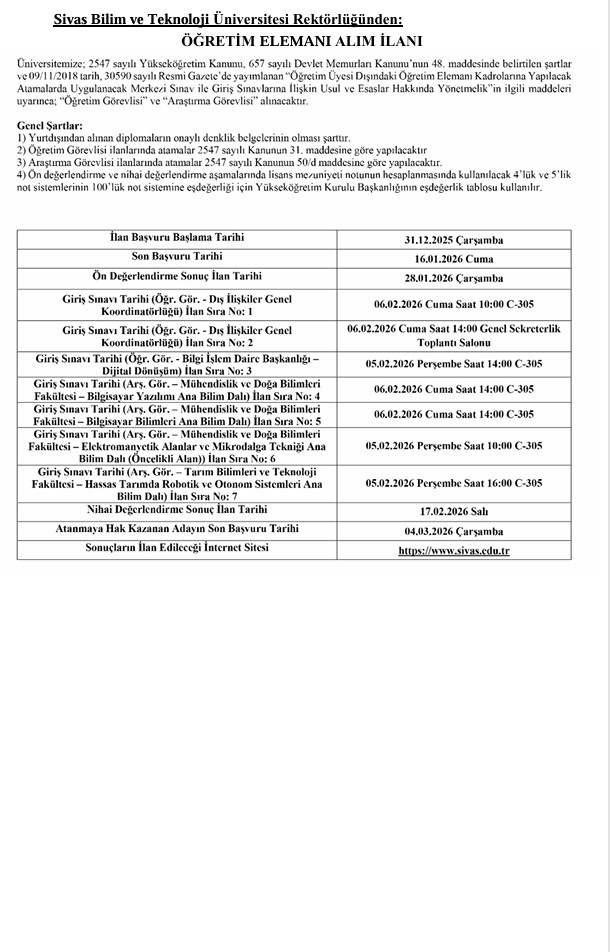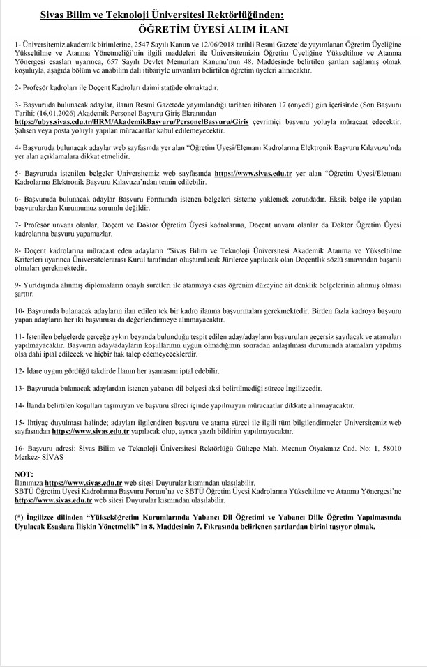 Sivas Bilim ve Teknoloji Üniversitesi, akademik personel alımı, öğretim üyesi alımı, öğretim elemanı alımı, profesör, doçent, doktor öğretim üyesi, araştırma görevlisi, öğretim görevlisi