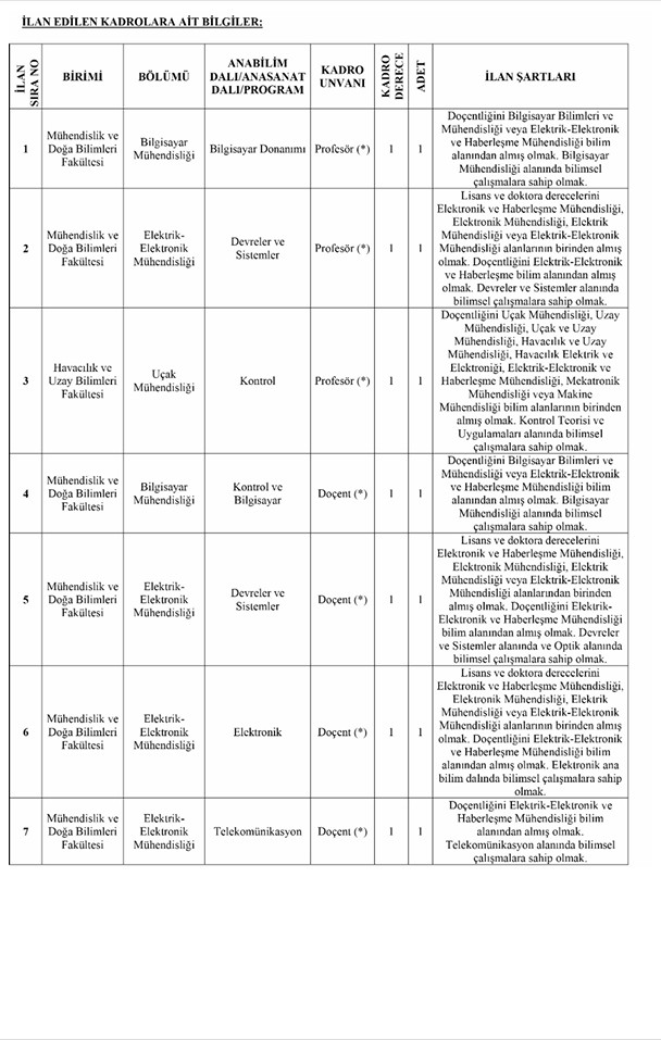 Üniversite tarafından yapılan açıklamada, alımların 2547 sayılı Yükseköğretim Kanunu ile ilgili yönetmelikler çerçevesinde gerçekleştirileceği belirtildi. İlan kapsamında özellikle Mühendislik ve Doğa Bilimleri Fakültesi, Havacılık ve Uzay Bilimleri Fakültesi ile Tarım Bilimleri ve Teknoloji Fakültesi bünyesinde çok sayıda akademik kadronun açıldığı ifade edildi.