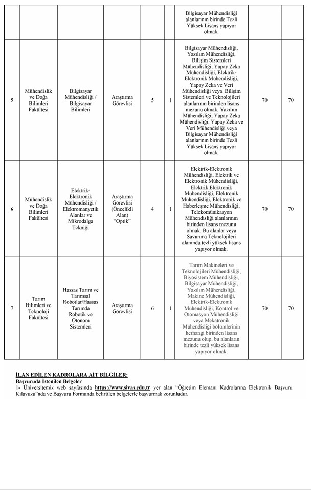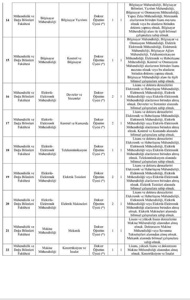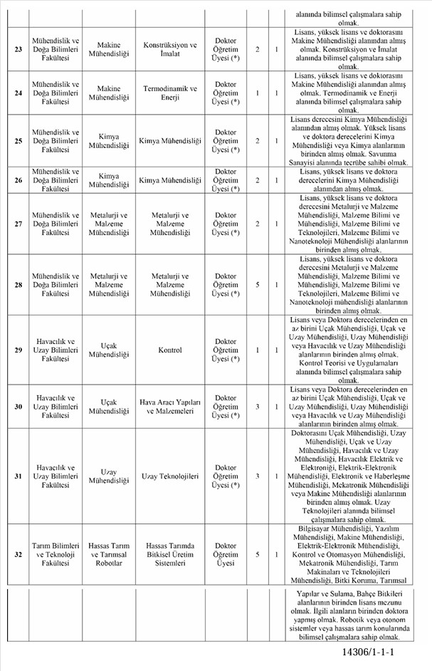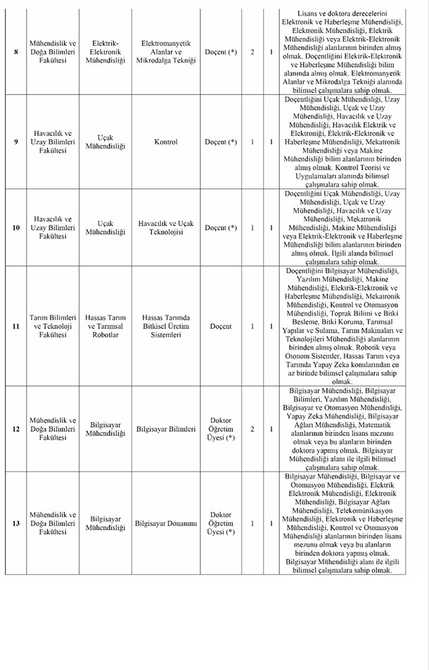 Yayımlanan ilana göre; bilgisayar mühendisliği, elektrik-elektronik mühendisliği, makine mühendisliği, kimya mühendisliği, metalurji ve malzeme mühendisliği, uçak ve uzay mühendisliği ile hassas tarım ve tarımsal robotlar gibi birçok alanda profesör, doçent ve doktor öğretim üyesi kadroları ilan edildi. İlan edilen kadrolarda kontrol ve bilgisayar, bilgisayar donanımı, bilgisayar yazılımı, devreler ve sistemler, telekomünikasyon, elektromanyetik alanlar, elektrik makineleri, mekanik, konstrüksiyon ve imalat, termodinamik ve enerji gibi çok sayıda uzmanlık alanı yer aldı.