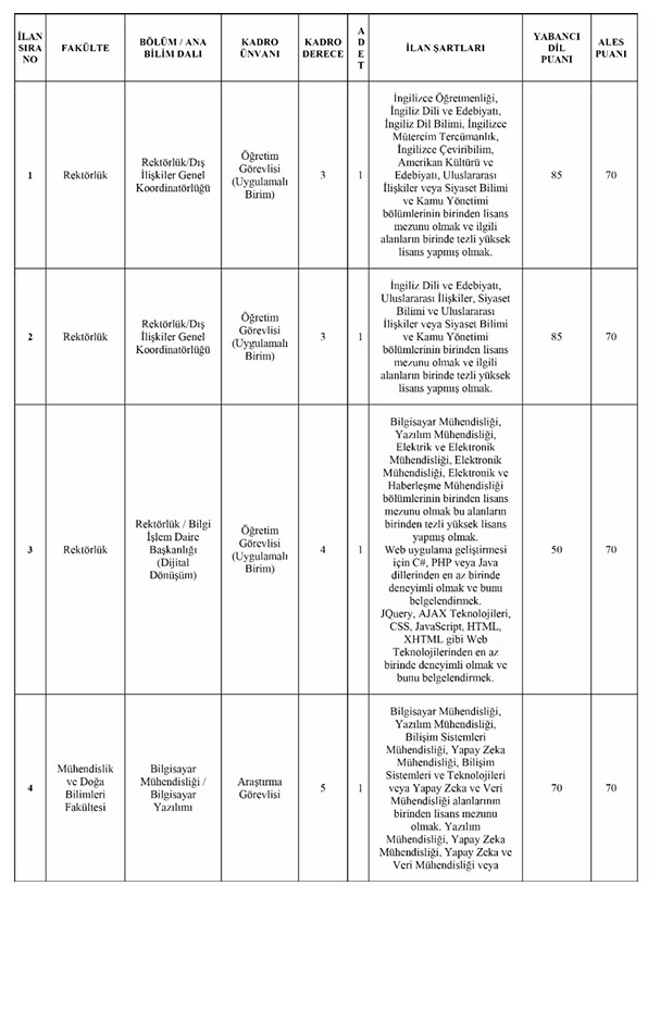 Rektörlük tarafından duyurulan ilana göre, farklı fakültelerde ve bölümlerde çok sayıda profesör, doçent, doktor öğretim üyesi, öğretim görevlisi ve araştırma görevlisi kadrosu için alım yapılacak.