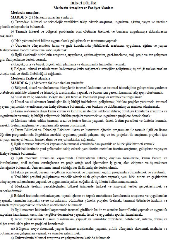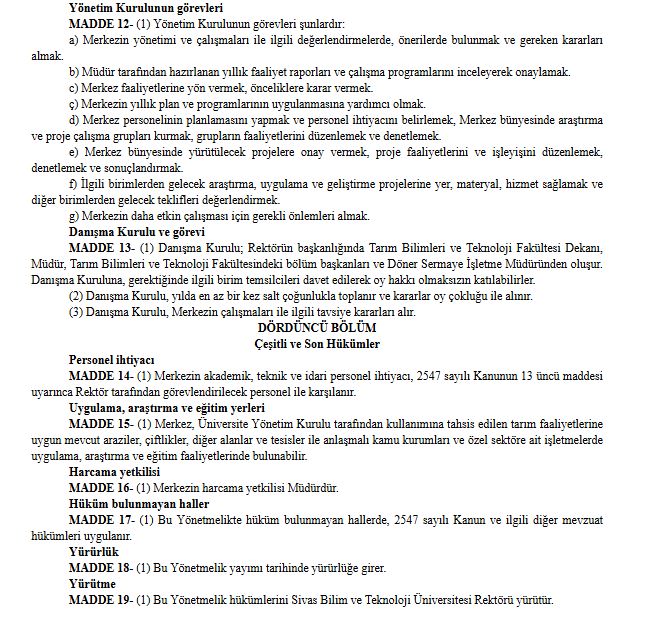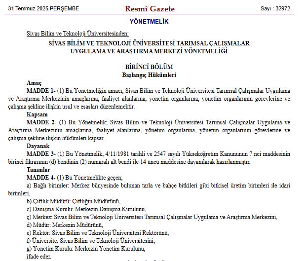 Sivas Bilim ve Teknoloji Üniversitesi, Tarımsal Çalışmalar Uygulama ve Araştırma Merkezi’nin işleyişine dair yeni yönetmeliğini Resmî Gazete’de yayımlayarak yürürlüğe koydu.