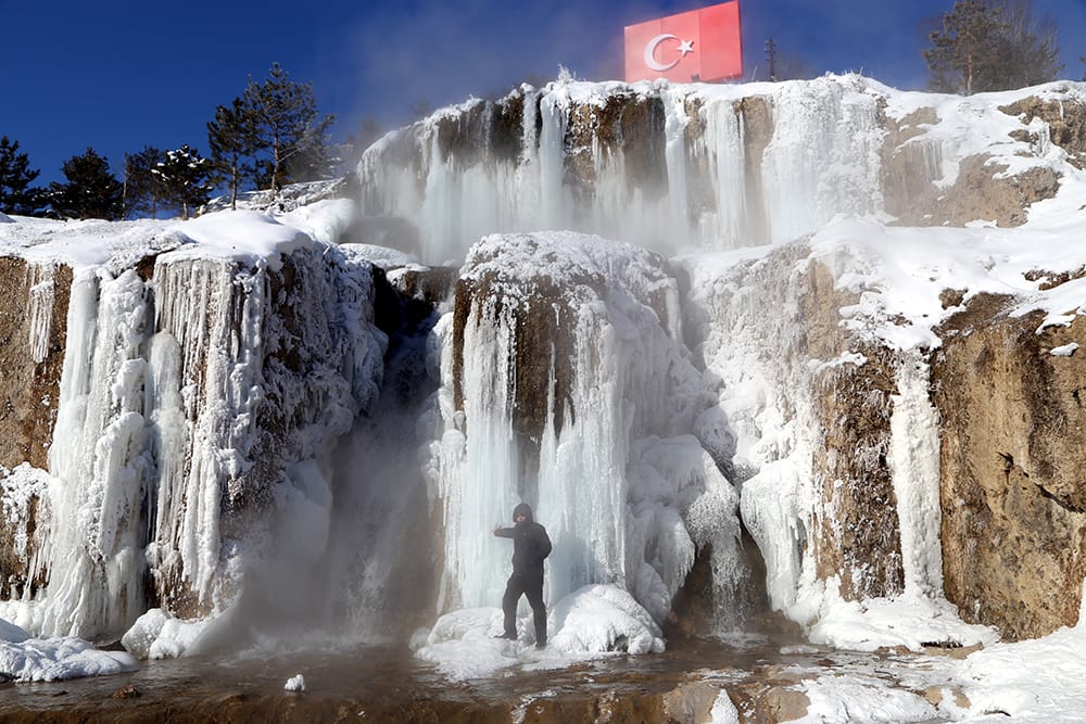 Gemerek ilçesine yaklaşık 25 kilometredeki Sızır Şelalesi, soğuk havanın etkisiyle buz tuttu.
