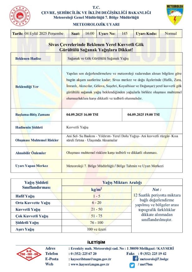 Meteoroloji Genel Müdürlüğü 7. Bölge Müdürlüğü, Sivas ve çevreleri için yerel kuvvetli sağanak yağış uyarısında bulundu.