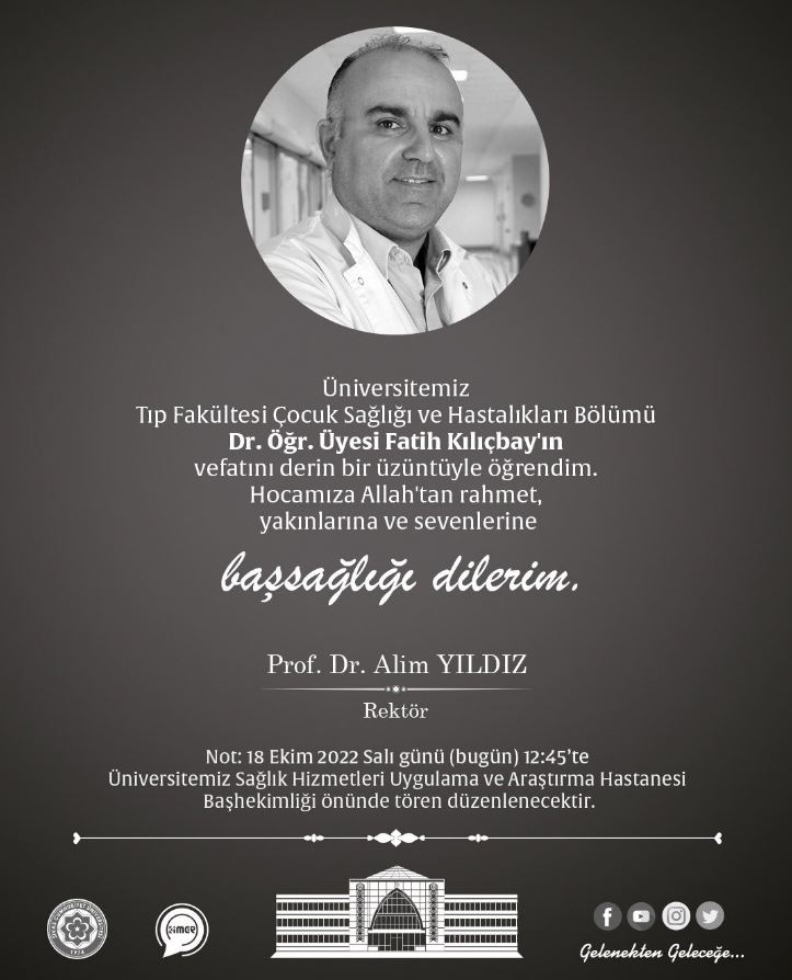 Sosyal medya paylaşımında Sivas Cumhuriyet Üniversitesinin Tıp Fakültesi Çocuk Sağlığı ve Hastalıkları Bölümü Dr. Öğr. Üyesi Fatih Kılıçbay'ın vefat ettiği belirtildi.