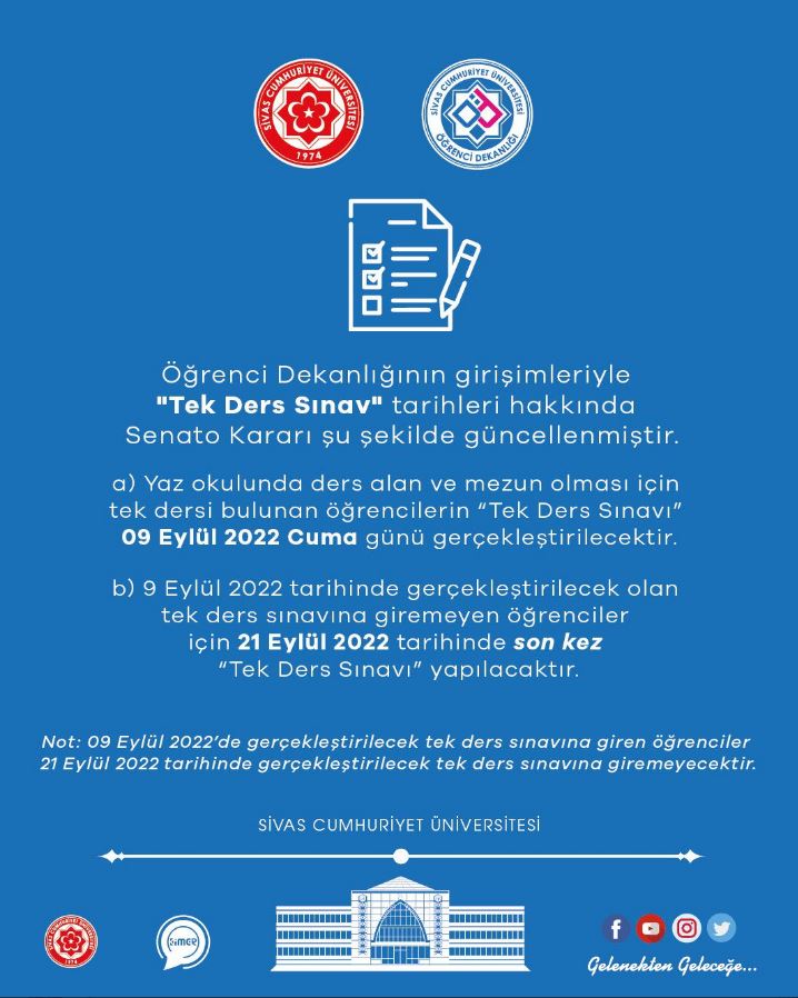 Sivas Cumhuriyet Üniversitesi sosyal medya hesabından yaptığı paylaşımla Tek Ders Sınavı için senato kararının güncellendiğini açıkladı.