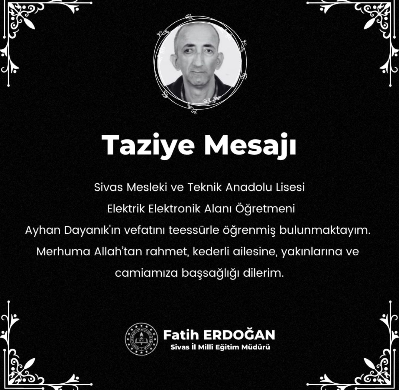 Sivas İl Milli Eğitim Müdürü Fatih Erdoğan yayımladığı taziye mesajında, Ayhan Dayanık’ın vefatını derin bir teessürle öğrendiğini belirterek, merhuma Allah’tan rahmet, ailesine, yakınlarına ve eğitim camiasına başsağlığı dileklerini iletti.