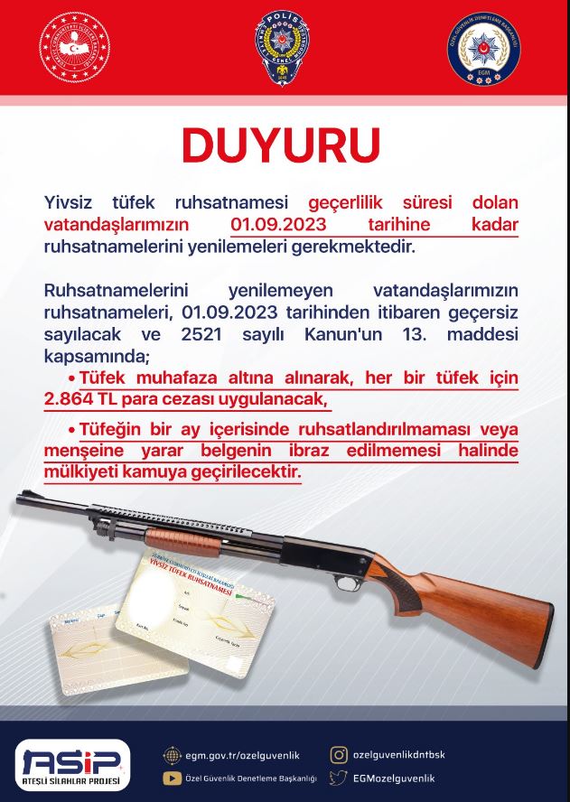 Emniyet Müdürlüğü tarafından yapılan açıklamada: "Yivsiz tüfek ruhsatnamesi geçerlilik süresi dolan vatandaşlarımızın 01.09.2023 tarihine kadar ruhsatnamelerini yenilemeleri gerekmektedir."