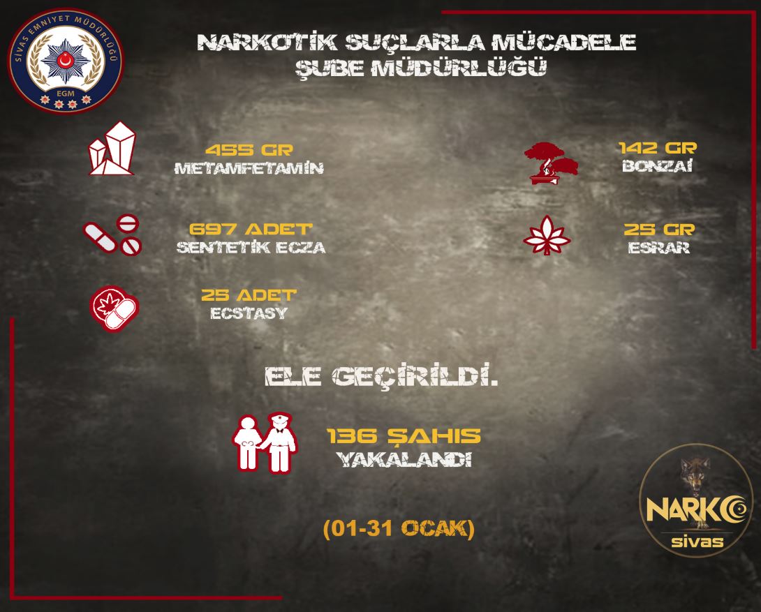 Sivas İl Emniyet Müdürlüğü Narkotik Suçlarla Mücadele Şube Müdürlüğü ekipleri, 1-31 Ocak tarihleri arasında gerçekleştirdiği başarılı operasyonlarla uyuşturucu madde ticareti ve kullanımına büyük darbe vurdu.
