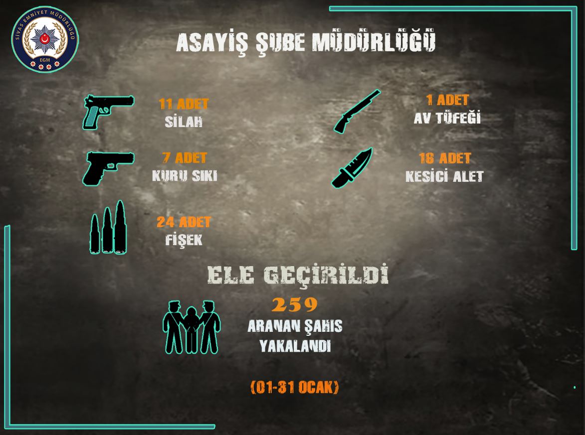 Sivas İl Emniyet Müdürlüğü Asayiş Şube Müdürlüğü, 1-31 Ocak tarihleri arasında gerçekleştirdiği operasyonlarla suç ve suçlulara göz açtırmadı.