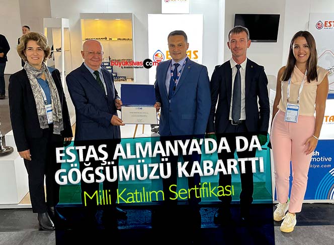 Estaş adına şirket yöneticileri Genel Müdür Osman Mavuş ve Dış Ticaret Yöneticisi Abidin Özkan Almanya'da sertifikayı alırken, fuarın en iyi temsil sertifikasını alarak otomotivin kalbine damgasını vuran Sivas'ın gururu Estaş'ı Büyük Sivas Medya Grubu olarak kutluyoruz...